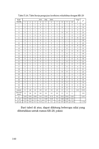 Tabel 5.16. Tabel kerja pengujian koefisien reliabilitas dengan KR-20 Dari tabel di atas, dapat dihitung beberapa nilai yang dibutuhkan untuk rumus KR-20, yakni: 140