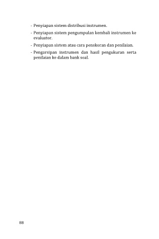 - Penyiapan sistem distribusi instrumen. - Penyiapan sistem pengumpulan kembali instrumen ke evaluator. - Penyiapan sistem atau cara penskoran dan penilaian. - Pengarsipan instrumen dan hasil pengukuran serta penilaian ke dalam bank soal. 88