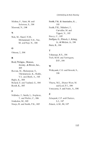 Slonje, R. and Smith, P.K., 105 Zidack, A.M., 88, 107